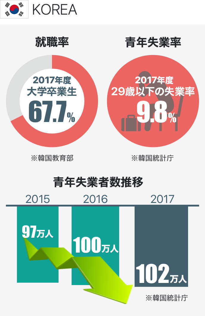 特に29歳以下の若年層の失業率が伸び続けており、2017年度で9.8%と非常に高く深刻な社会問題となっております。