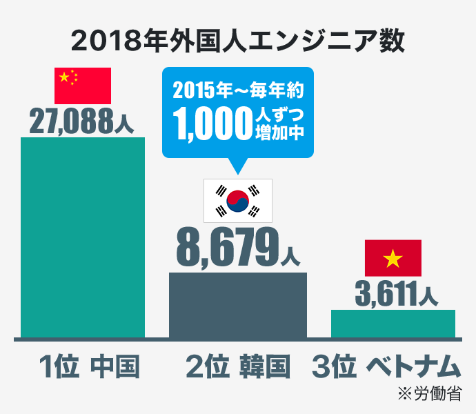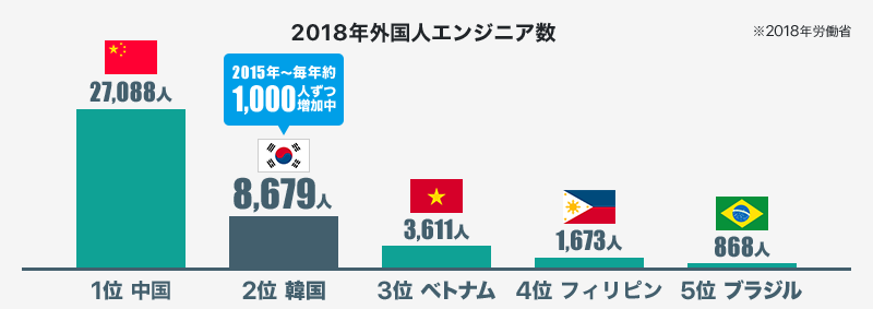 日本の外国人エンジニアのうち、韓国人は第2位の割合を占めており、2018年現在8,679人が日本で働いています。