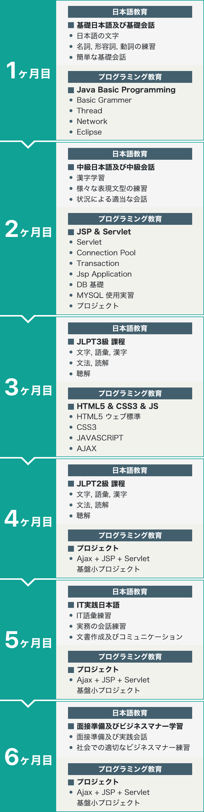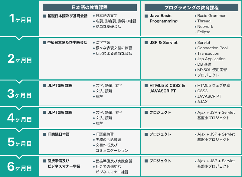 ほとんどの学生がクラス修了時には、ビザ取得に有利となる「基本情報技術者」の資格を取得します。また、韓国語と日本語は文法が同じなので、韓国の方は通常6ヶ月程度でJLPT-N2レベルを習得します。