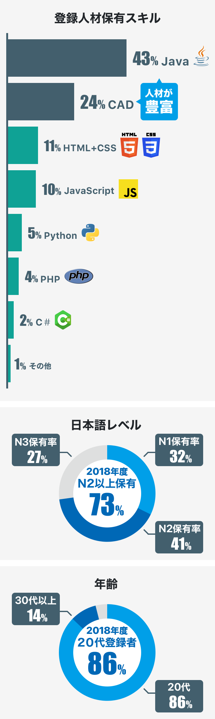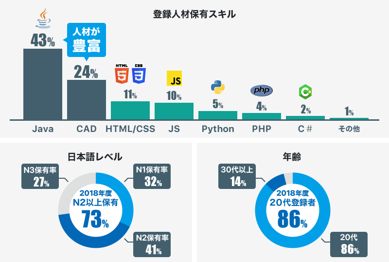 具体的には、保有スキルについてはJava43%、CAD24%、HTML+CSS11%、JavaScript10%、Python5%、PHP4%、C#2%、その他1%となっております。
