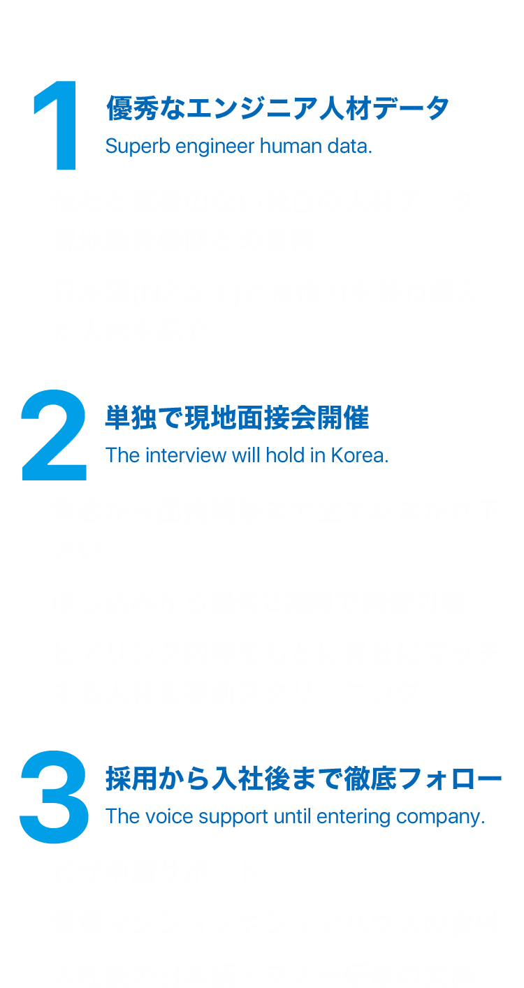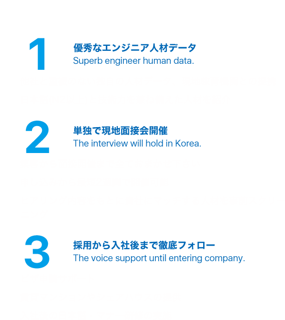 弊社の登録人材は韓国人エンジニアのみのため、競合他社とは重複のしない人材データーとなっております。